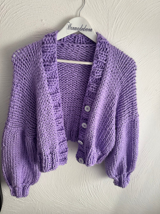 Handmade Lilac Chunky Knit Cropped Cardigan (Size 16–20) | Optional Daisy Detail