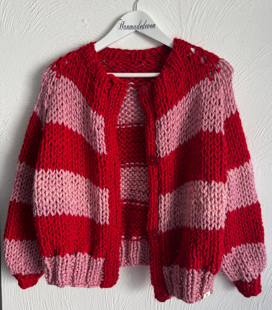 Chunky Hand-Knit Striped Cardigan – Red & Pink | Cozy, Bold Statement Knitwear