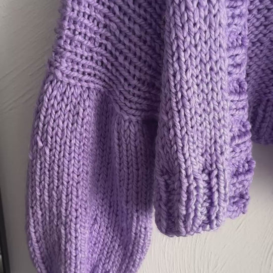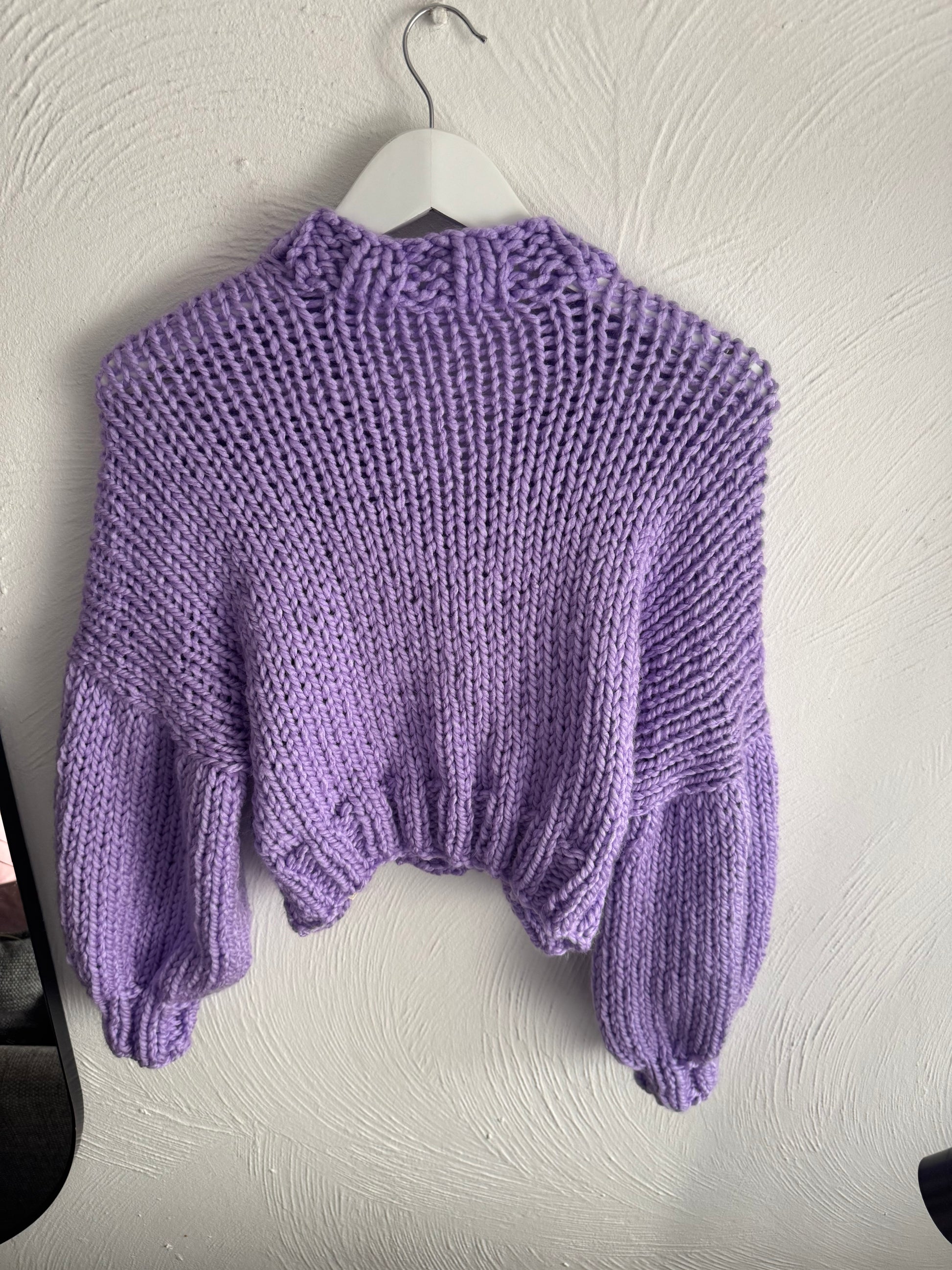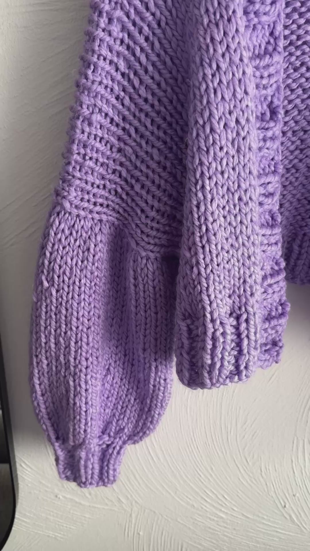 Wrap yourself in cosy style with this hand-knitted lilac cardigan, designed in a cropped, boxy fit that flatters sizes 16–20. Crafted with chunky yarn for warmth and comfort, this piece is perfect for layering over dresses, jeans, or skirts.
