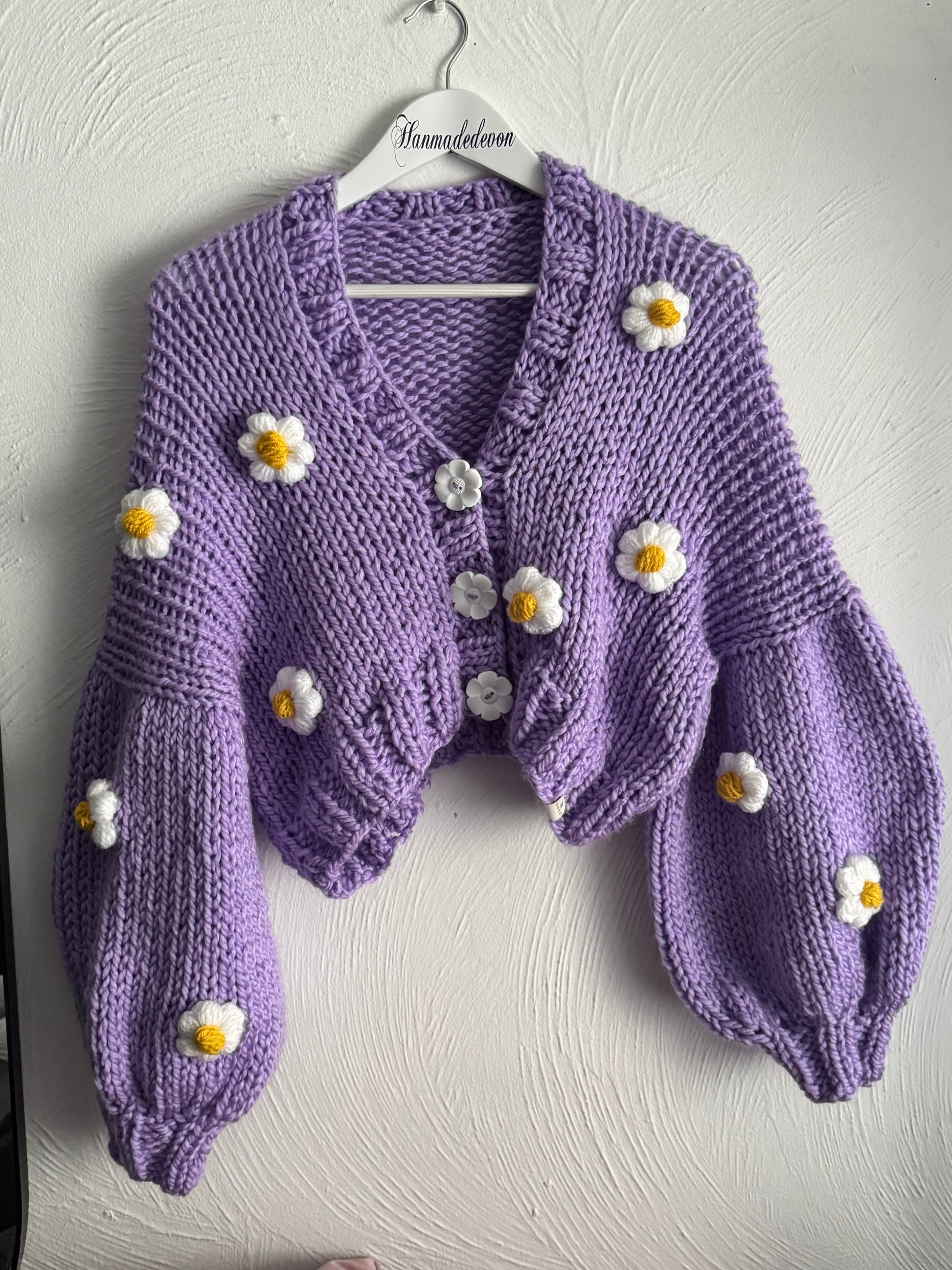 Handmade Lilac Chunky Knit Cropped Cardigan (Size 16–20) | Optional Daisy Detail